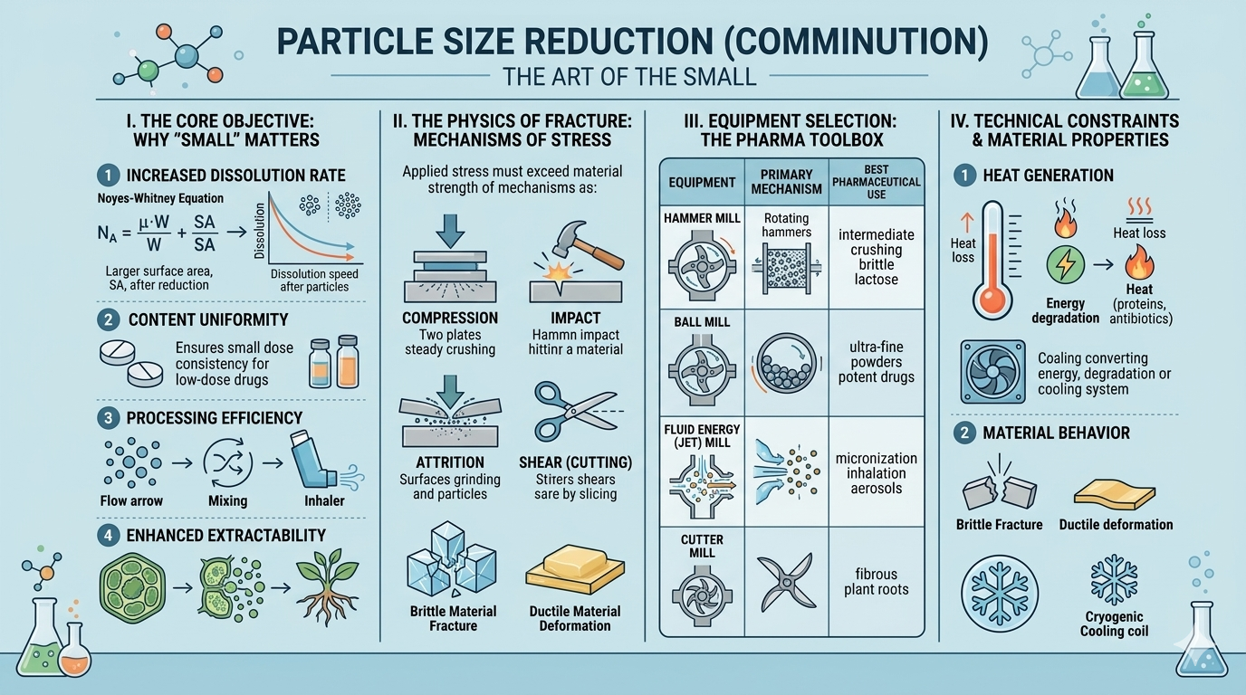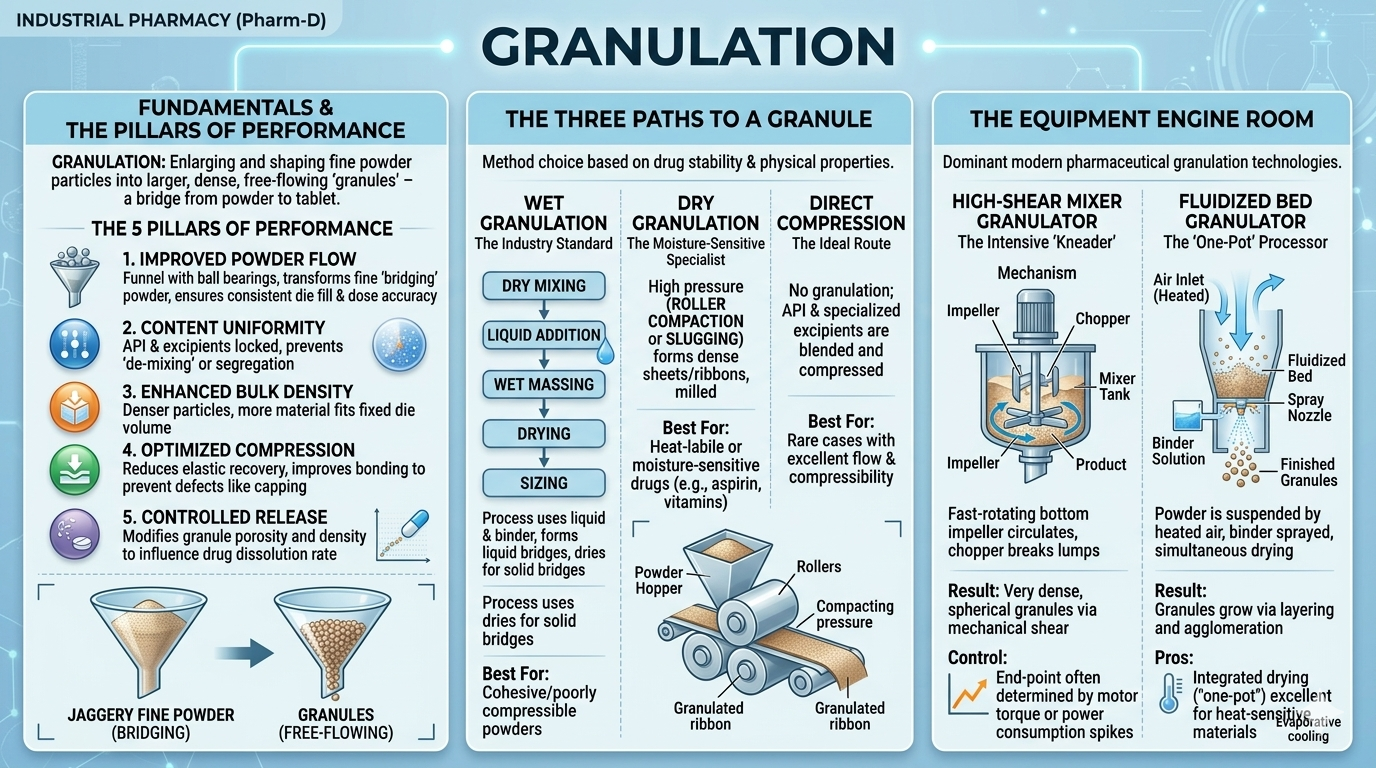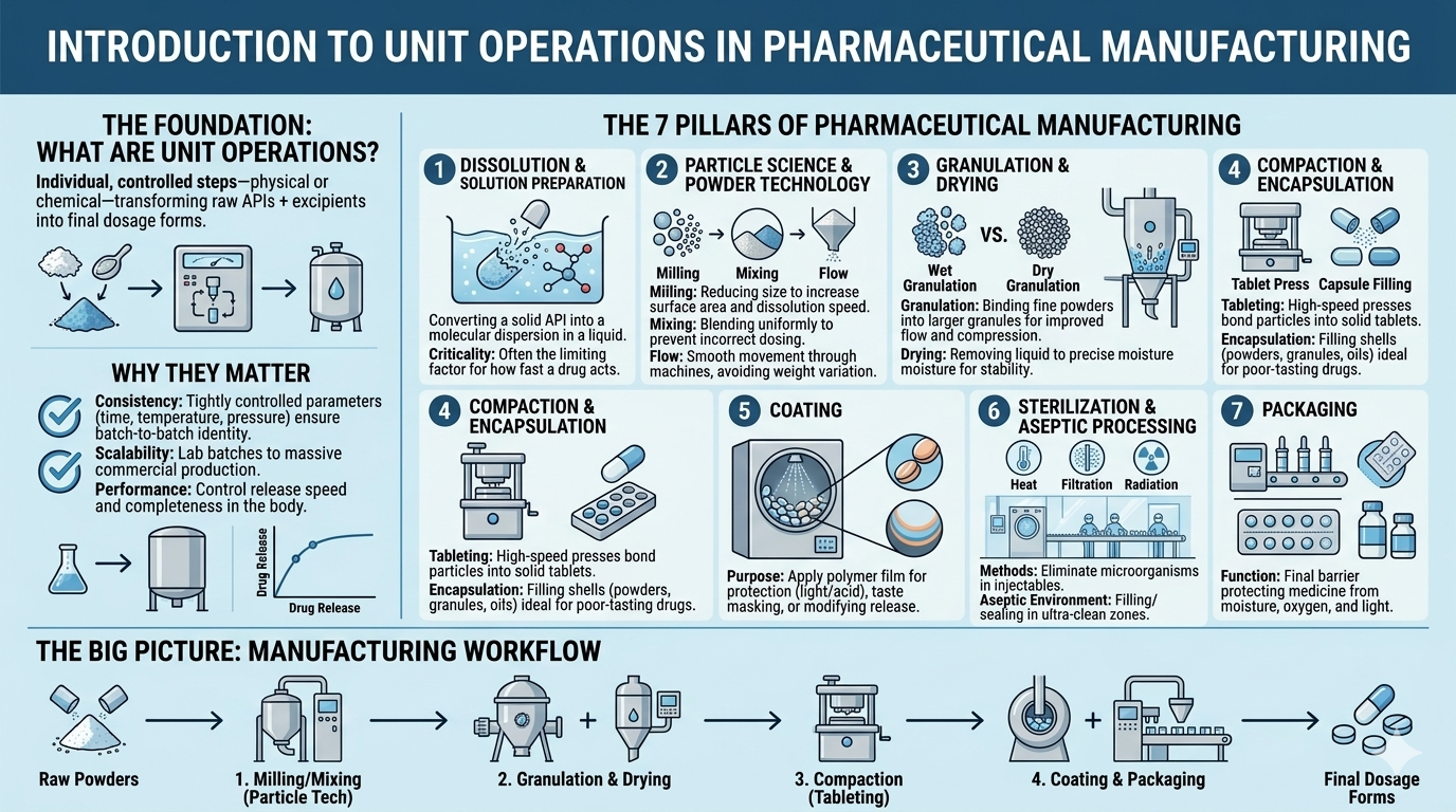 The science and technology of large-scale drug manufacturing β from foundational unit operations and mixing through granulation, compression, coating, drying, and particle size reduction to the finished dosage form.