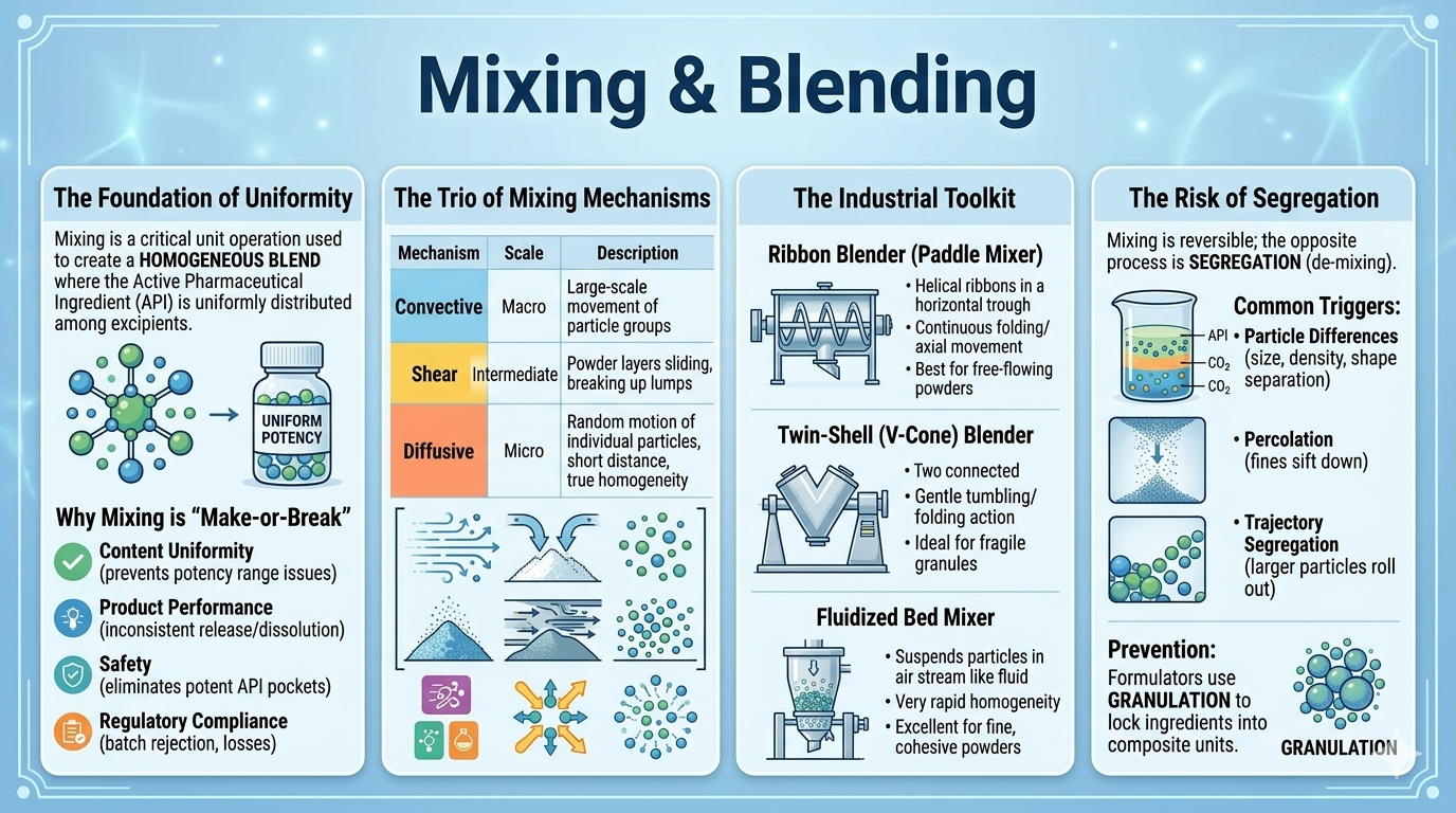 Mechanisms of mixing (convective, diffusive, shear), tumble blenders, ribbon mixers, high-shear mixers, static mixers, blend uniformity, segregation, and quality control of mixed products.