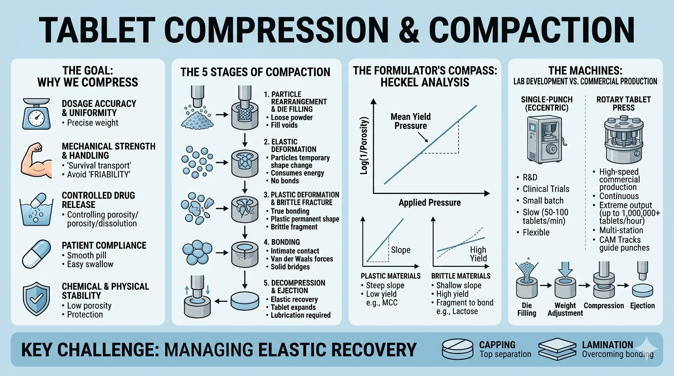 Single-punch and rotary tablet presses, compression force and hardness, tooling types, tablet defects (capping, lamination, sticking), compaction profiles, direct compression, and in-process controls.