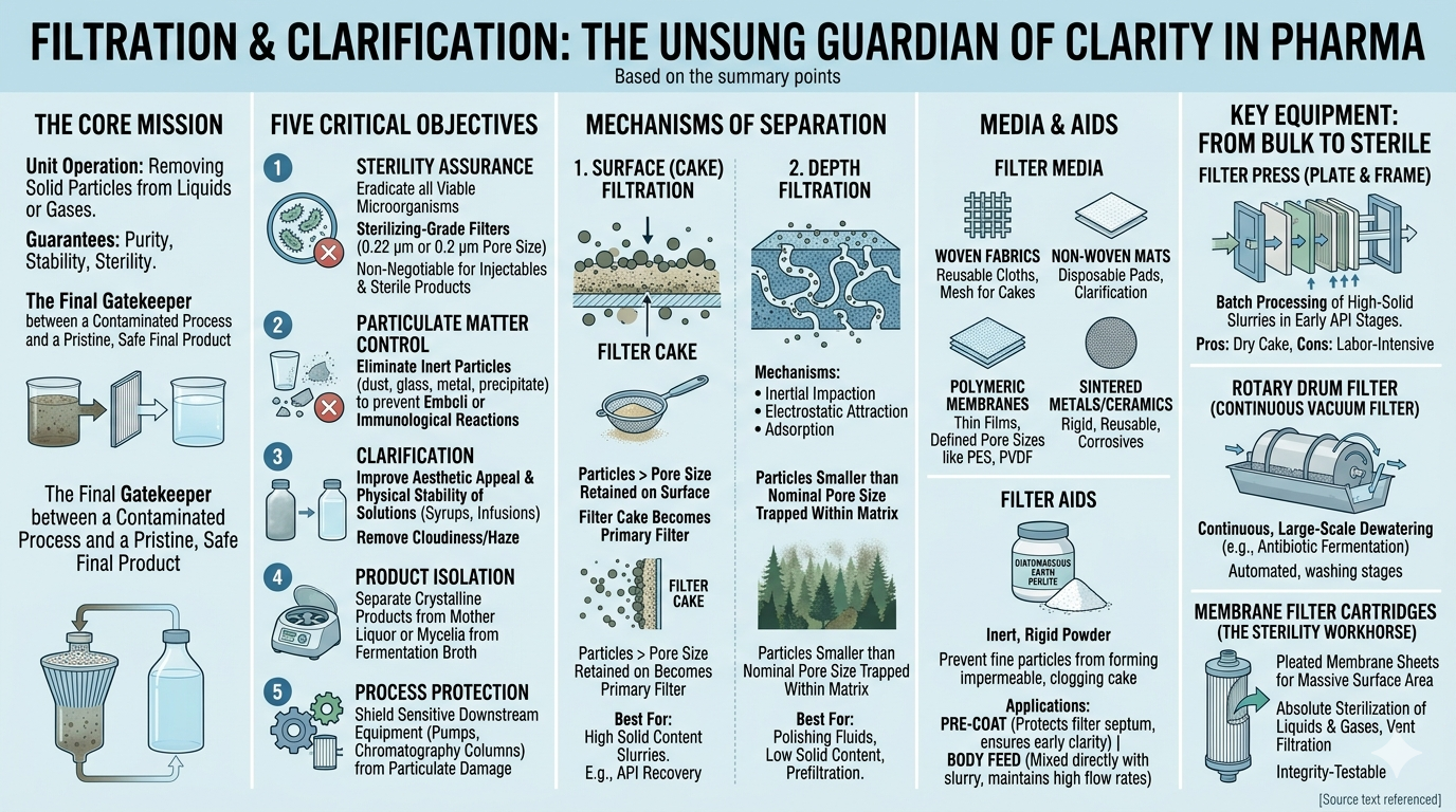Filter media and filter aids, depth and surface filtration, pressure and vacuum filtration, membrane filtration, sterile filtration, centrifugation, and clarification of pharmaceutical liquids.