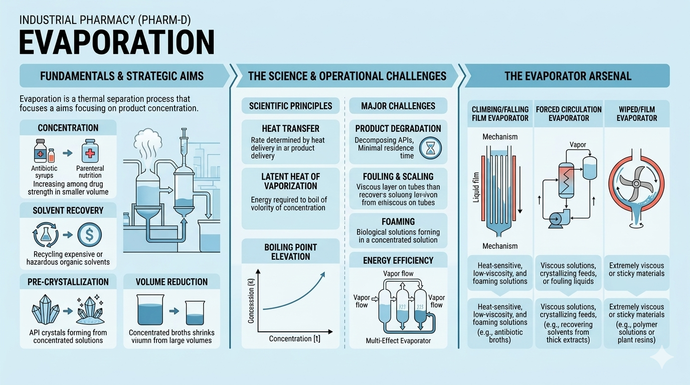 Principles of evaporation, types of evaporators (falling film, rising film, wiped film, multiple-effect), heat transfer, vapour recompression, concentration of pharmaceutical solutions, and energy efficiency.