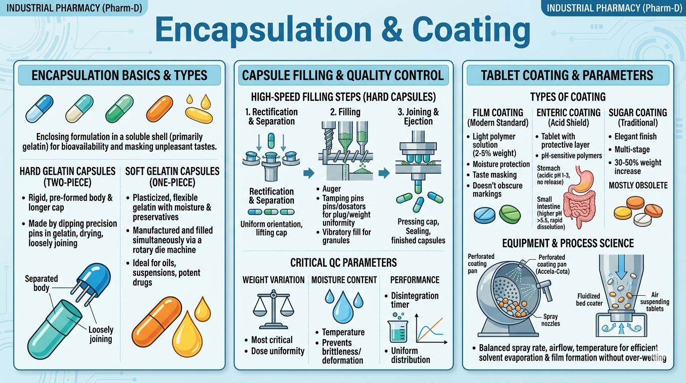 Hard and soft gelatin capsule filling, capsule sealing, pan coating, fluidised-bed coating, film coating formulations, enteric coatings, modified-release coatings, and coating defects.