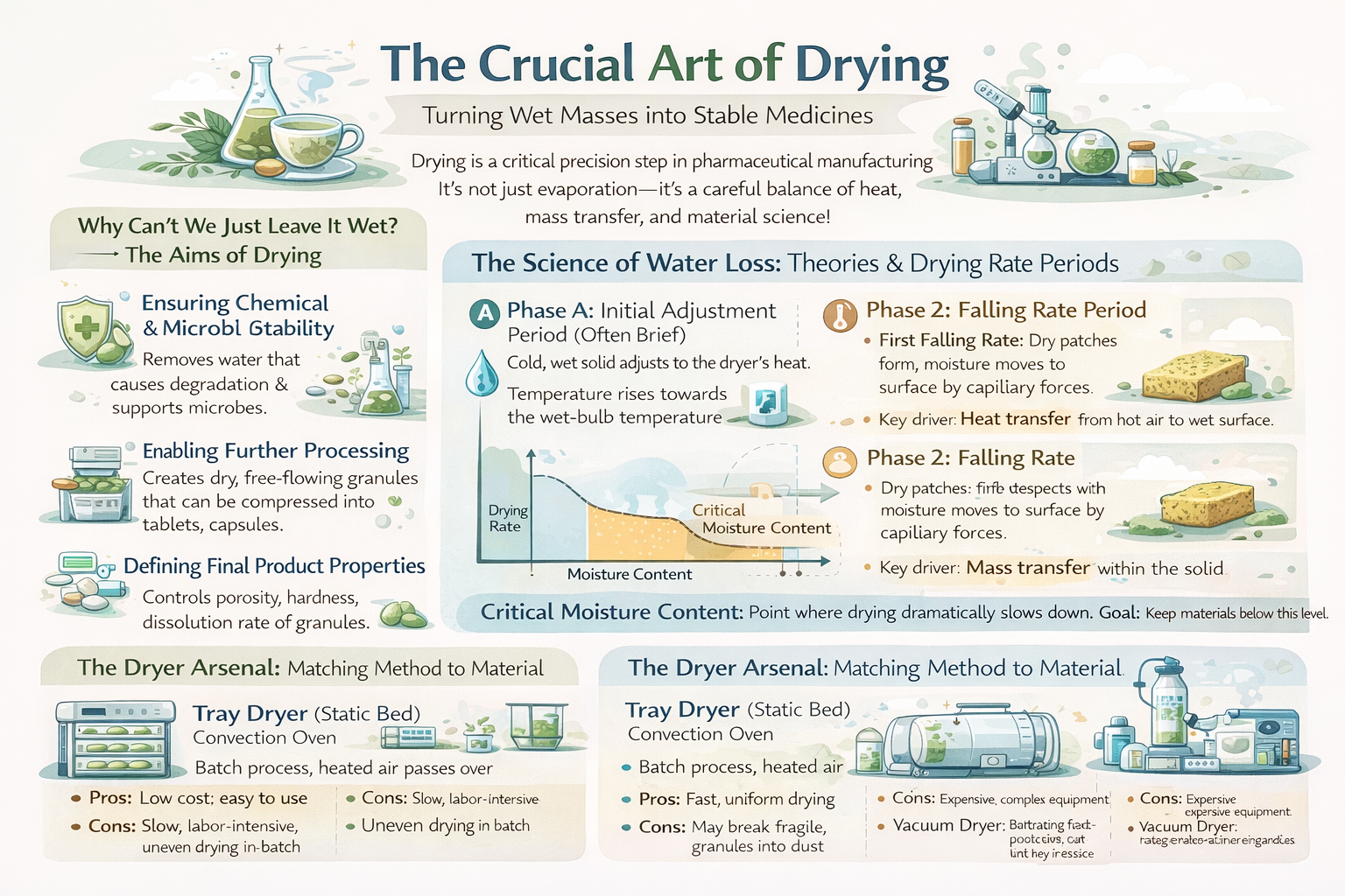 Moisture content and drying rate curves, tray drying, fluidised-bed drying, spray drying, freeze drying (lyophilisation), infrared and microwave drying, and moisture specifications for pharmaceutical products.
