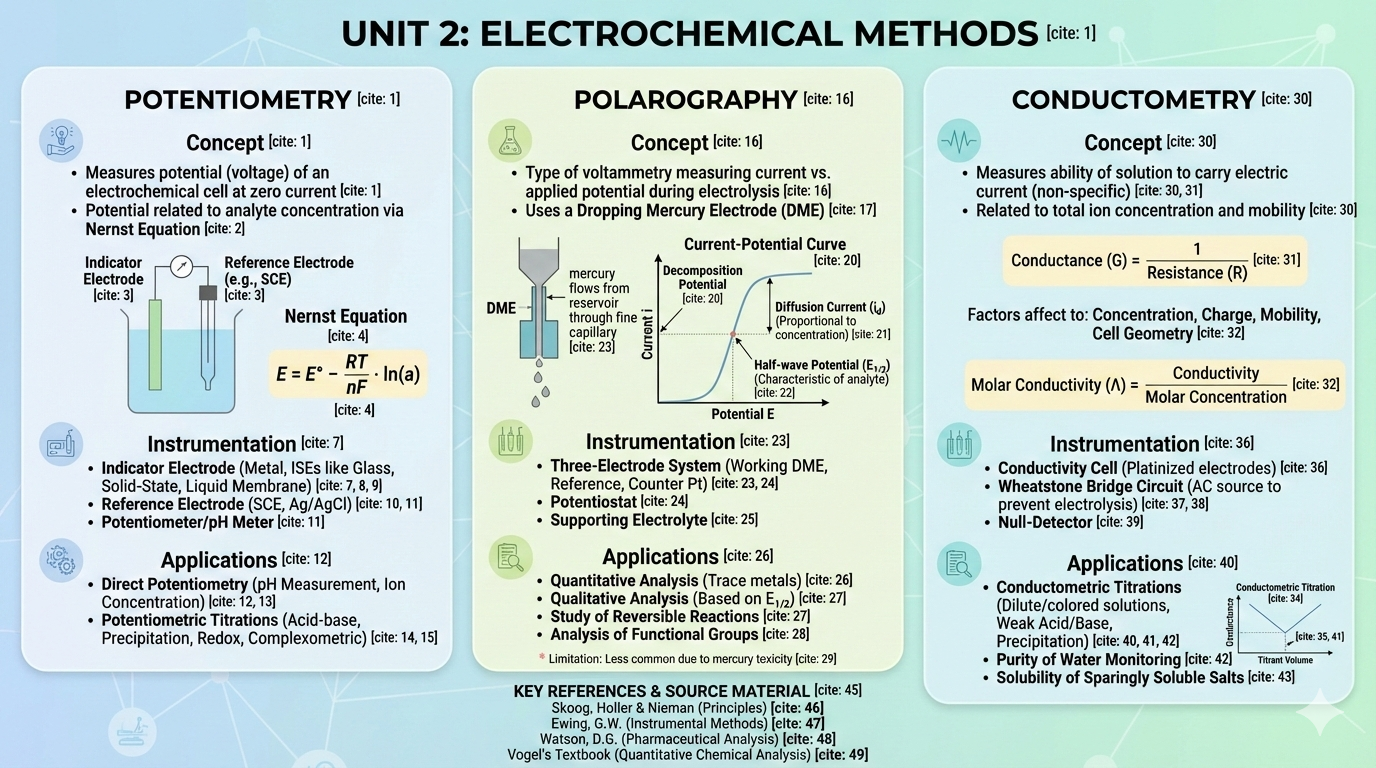 Potentiometry, pH measurement, ion-selective electrodes, conductometry, polarography, amperometry, and coulometry — principles and pharmaceutical applications.