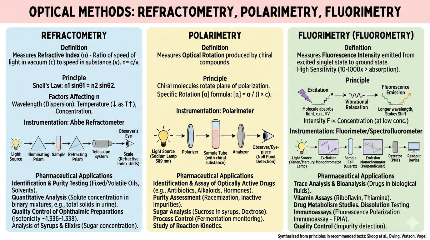 UV-Visible spectrophotometry, Beer-Lambert law, colorimetry, fluorimetry, flame photometry, atomic absorption spectroscopy, IR spectroscopy, and refractometry.