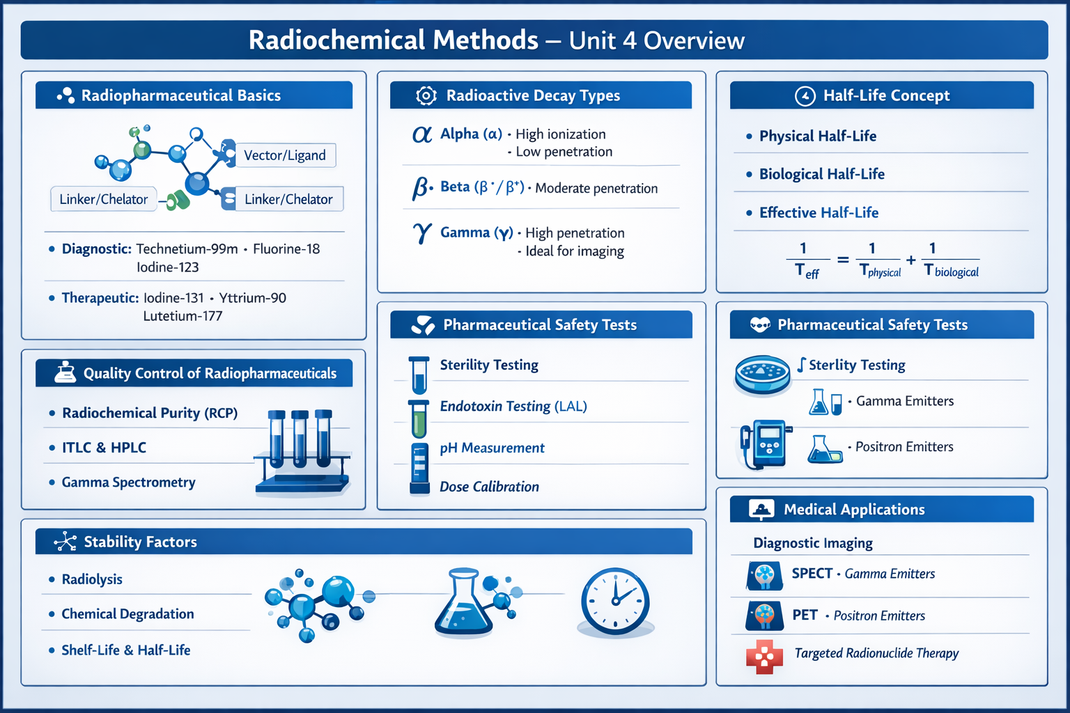 Radioactivity fundamentals, types of radiation, radioisotopes in pharmacy, radioimmunoassay, isotope dilution analysis, radiation safety, and nuclear pharmacy applications.