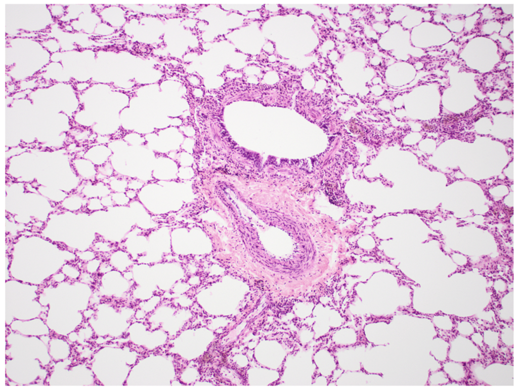 - Bronchi/bronchioles as round/oval structures with prominent smooth muscle walls
