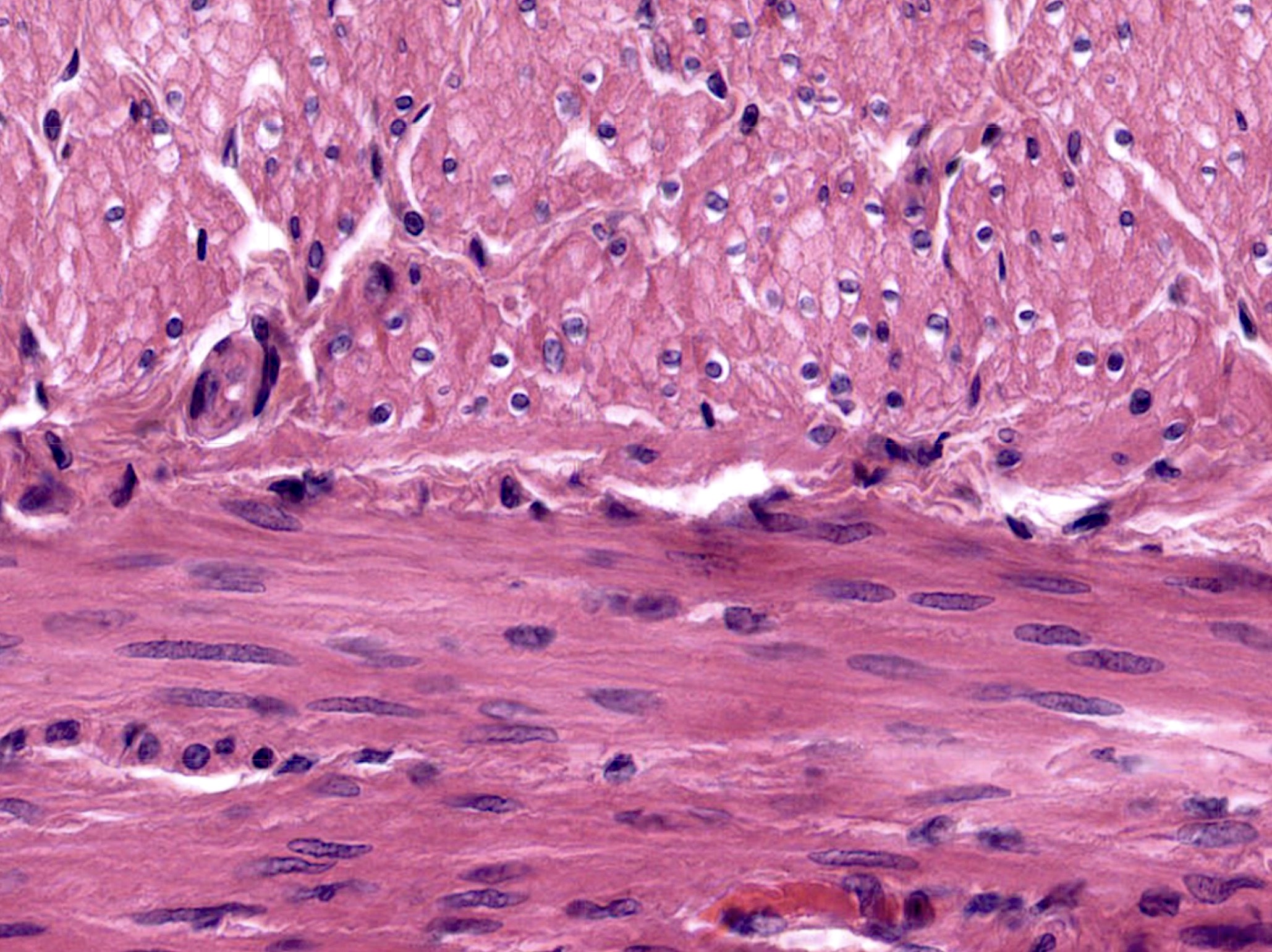 Smooth muscle cells are arranged in sheets or fascicles. In a longitudinal section, cells appear as elongated spindles staggered so the thickest part of one cell is adjacent to the tapered end of another — maximising packing efficiency. In cross-section, cells of varying diameters appear as irregularly sized circles (some cut through the widest part, some through the tapering ends).