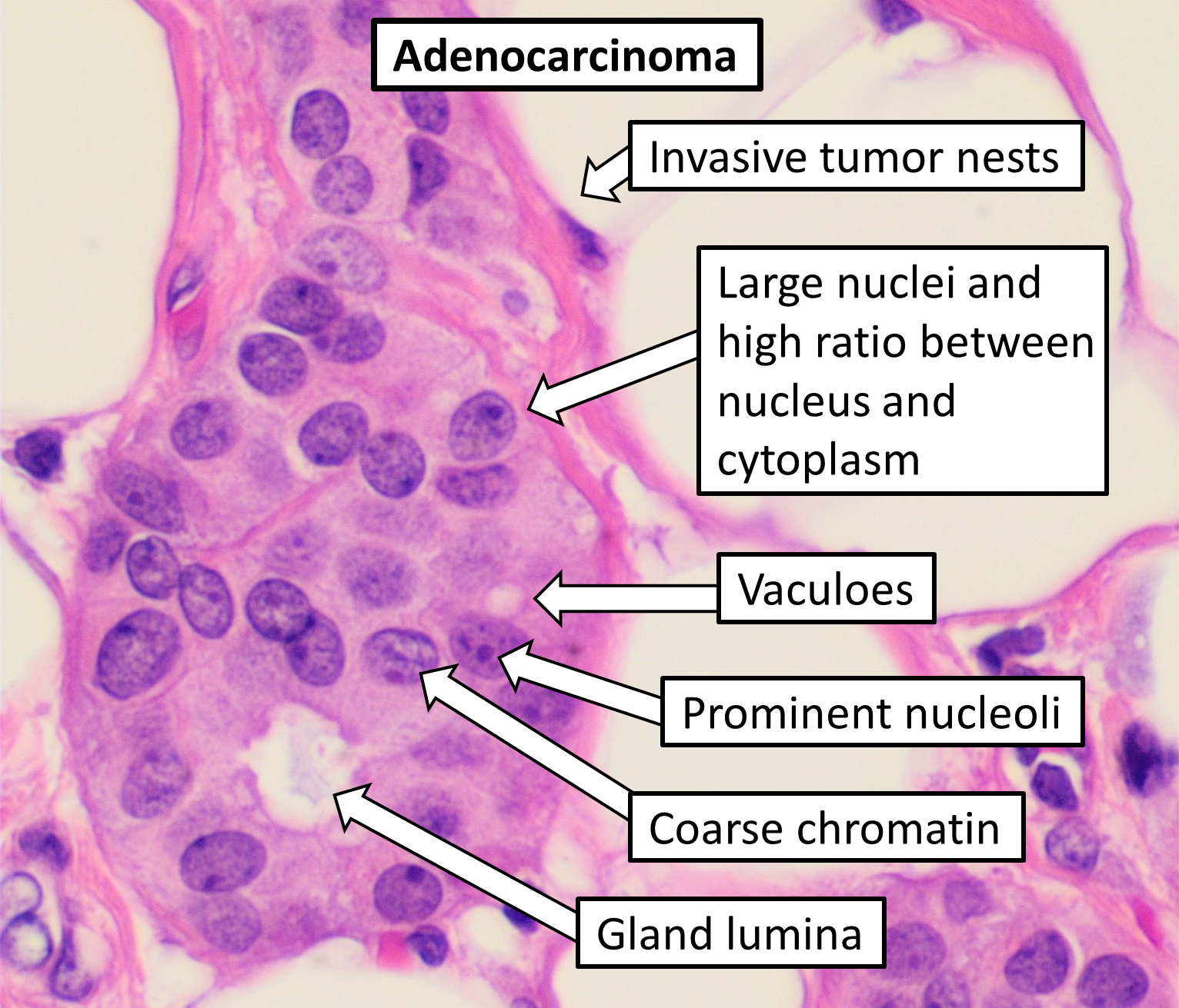 - Histopathology: glandular architecture, invasion, desmoplasia