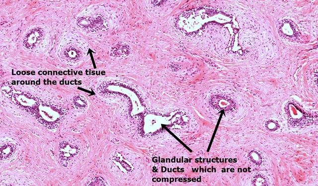 - Fibrous stroma arranged around and between acini