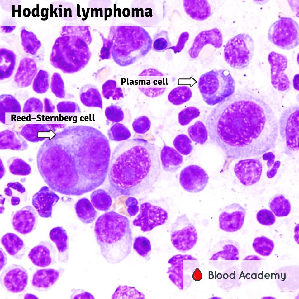- Reed–Sternberg cells: large binucleated / multinucleated cells — pathognomonic
